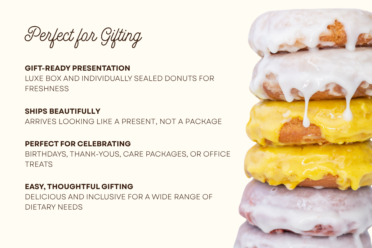 Make gifting one-click easy: our Corporate Donut Bundle delivers 96 award-winning vegan cake donuts (Vanilla, Lemon, Red Velvet) for $549 all-in with nationwide shipping included. Individually wrapped and packed as 16 gift-ready boxes (6 each) for effortless handoff—feeds 48–96. Good Housekeeping’s Best Donut 2025. Save $83 vs buying individual boxes. A corporate-gifting partner favorite, yet perfect for birthdays, showers, client gifts, and team events—buy multiples to scale. Choose monthly deliveries or Annual Prepay (12 months, 1 month free). Prefer the annual paid-in-full shipped all at once? Leave a note at checkout. Trusted by teams at leading companies. Loved by 500+ offices.