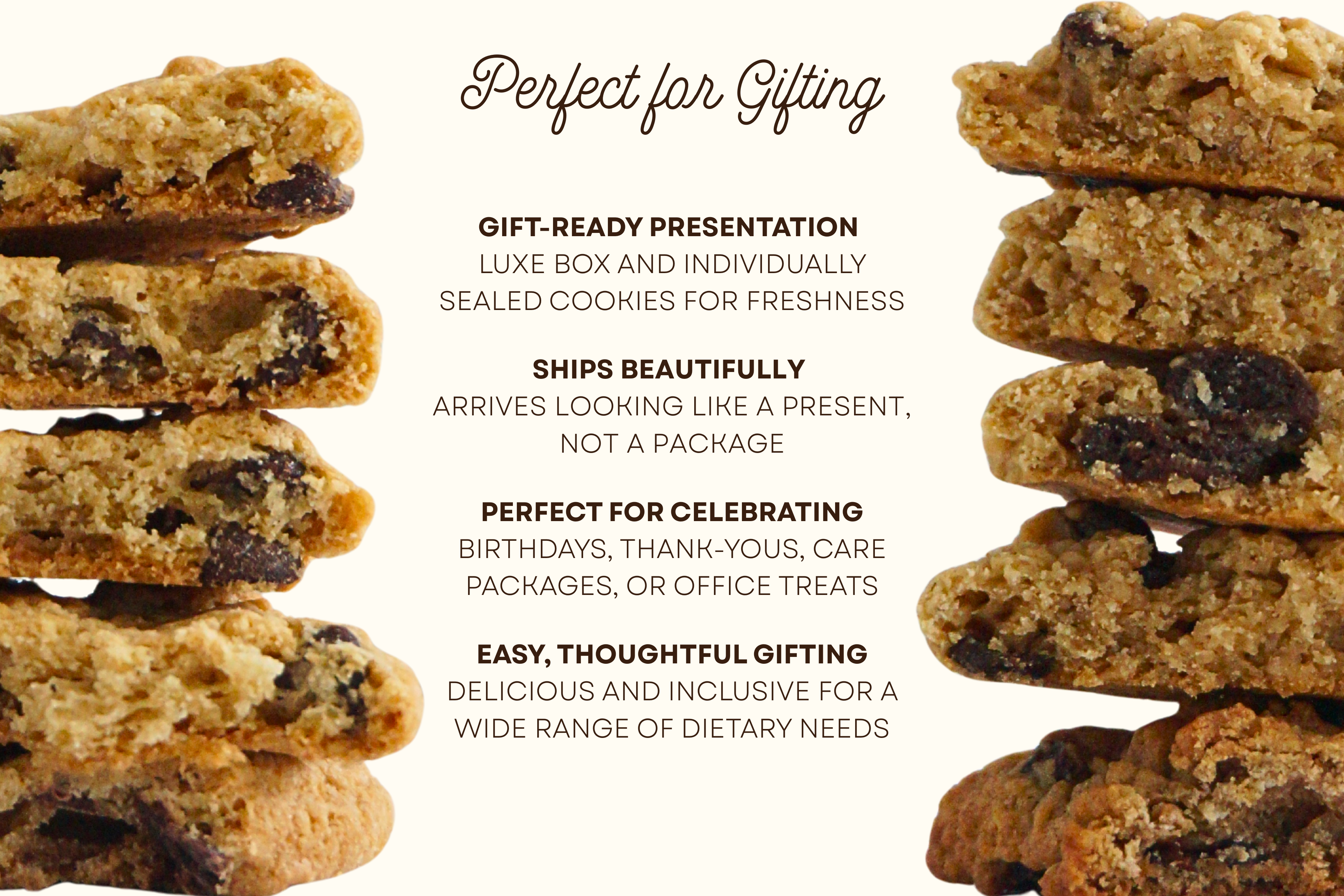 The classic you crave—vegan chocolate chip cookies with crisp edges, a chewy center, and loads of rich dairy-free chips. Baked fresh in San Antonio, individually wrapped, and delivered nationwide with free shipping. Nut-, soy-, dairy-, egg-, and dye-free (contains wheat) and packed in a premium gift box.