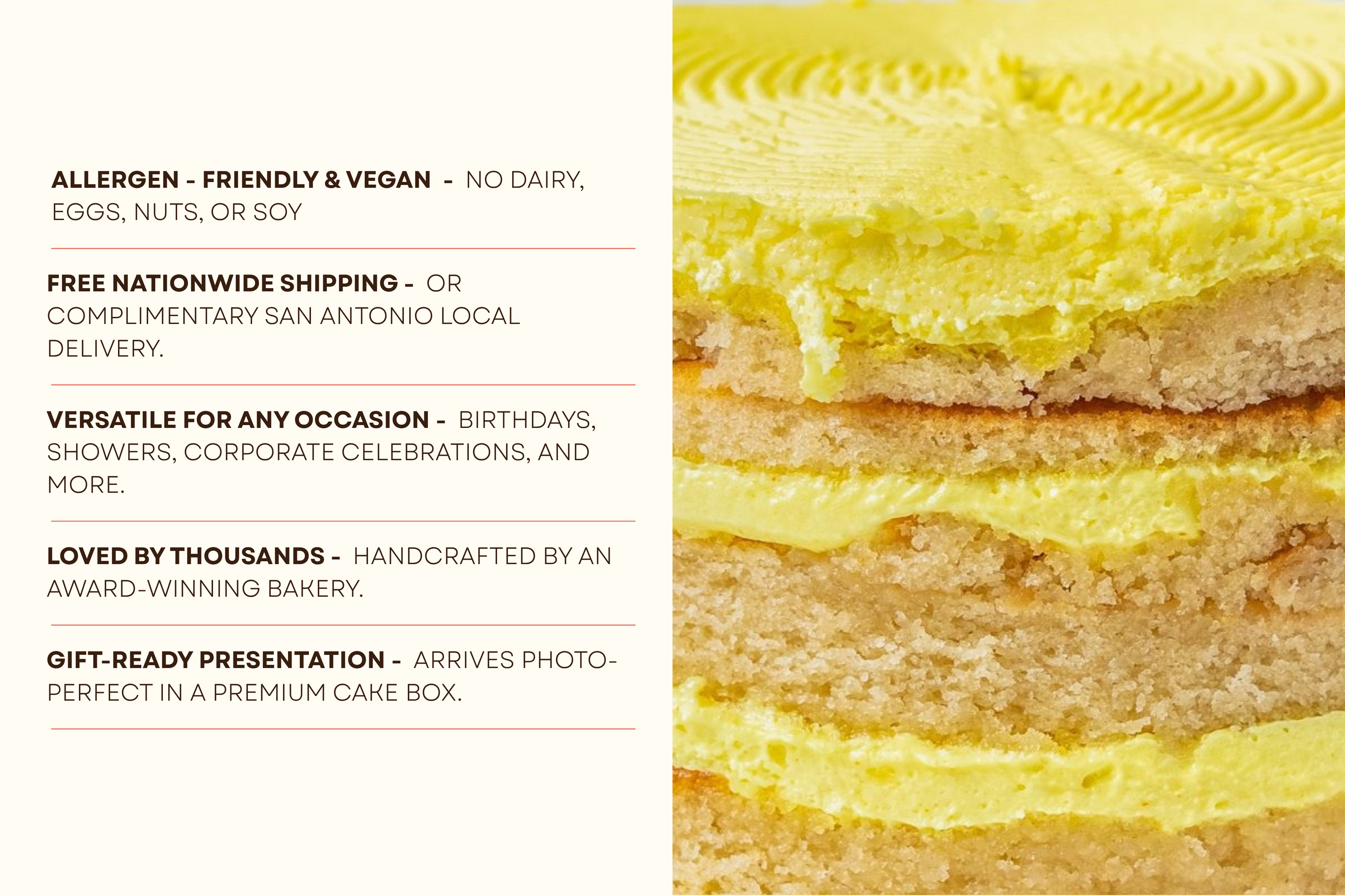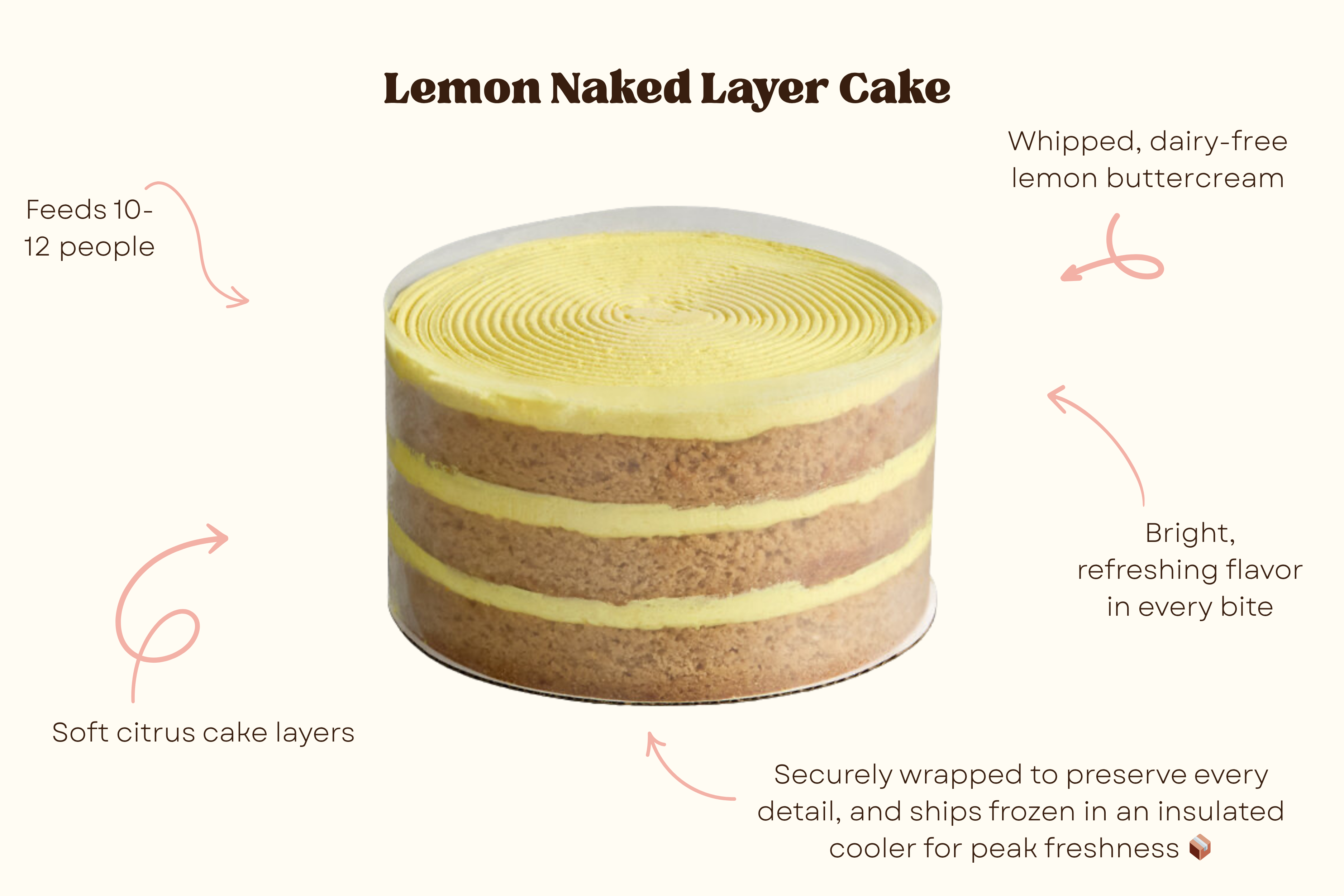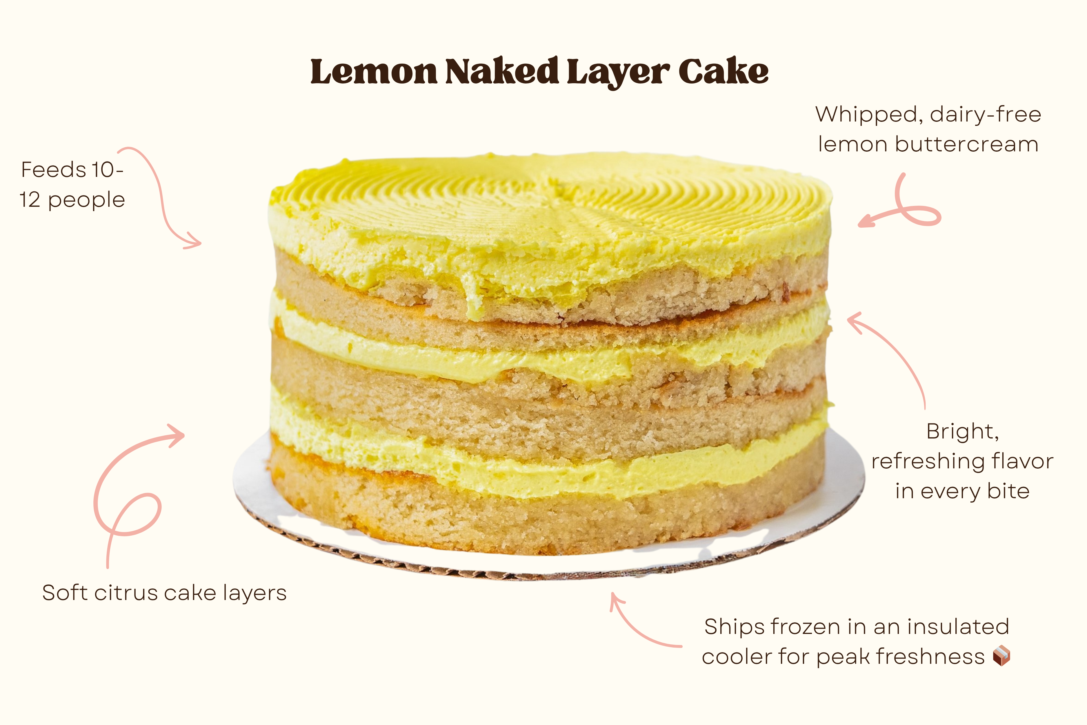Bright, tangy, and smooth. Our 8″ Vegan Lemon Naked Cake layers soft vanilla-lemon cake with whipped dairy-free lemon buttercream for a perfectly balanced taste - light, citrusy, and full of sunshine. This dairy-free lemon cake serves 10–12 and arrives celebration-ready, perfect for spring parties, thank-you gifts, or anytime you need a little zest.