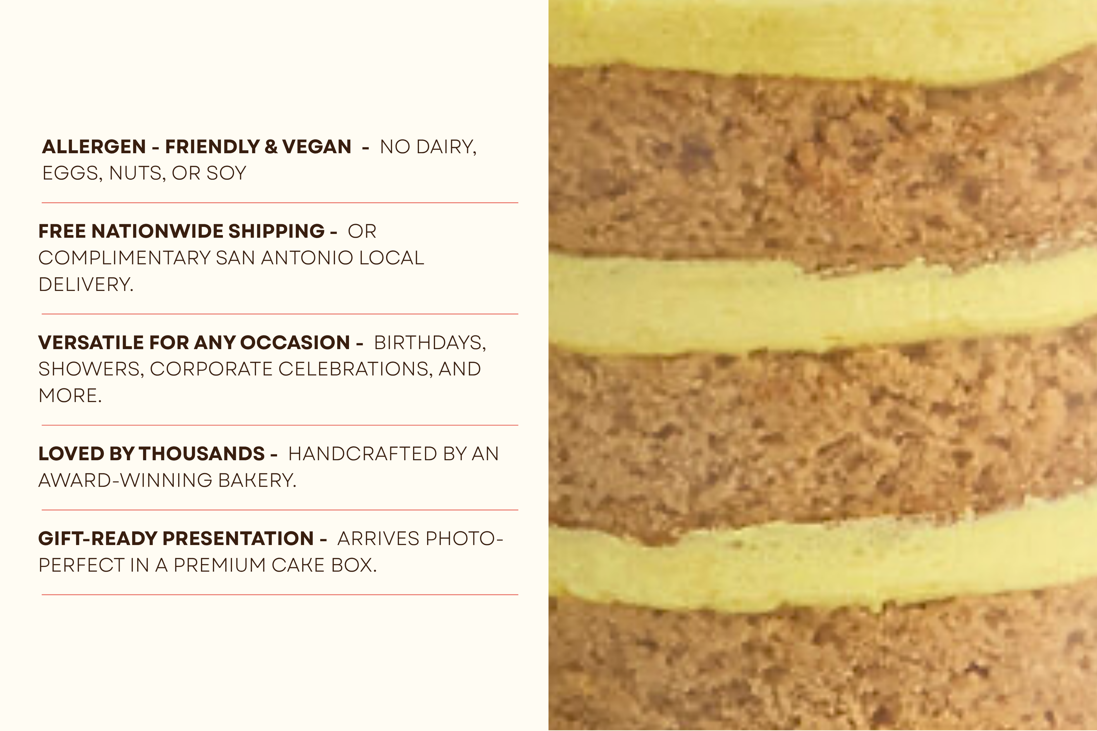 A naked cake is a style of cake with minimal frosting on the outside so you can see the beautiful layers of cake and filling. It’s modern, elegant, and lets the perfect balance of cake and frosting shine. Ours are 100% vegan, allergen-friendly, and baked fresh in San Antonio.