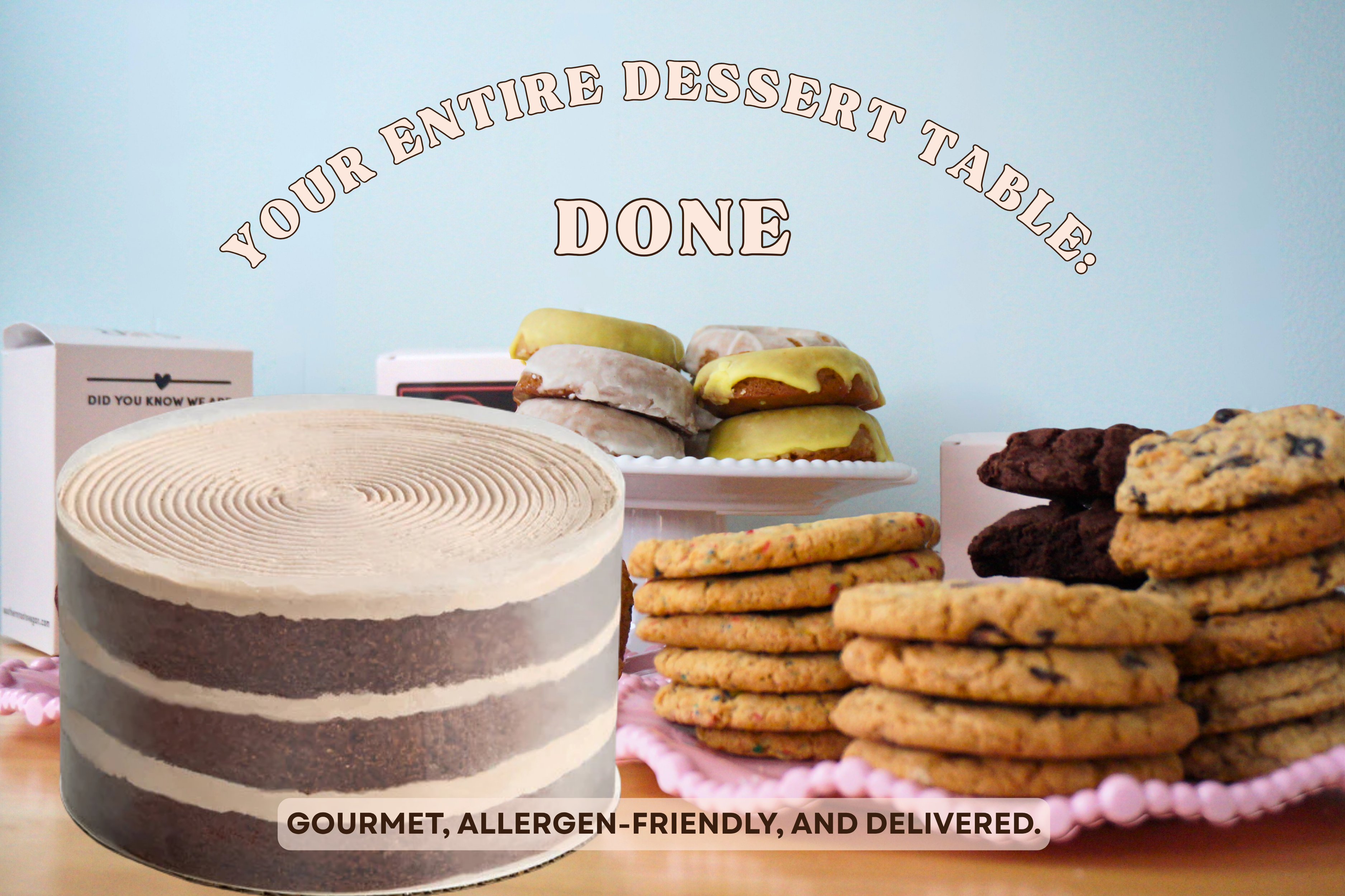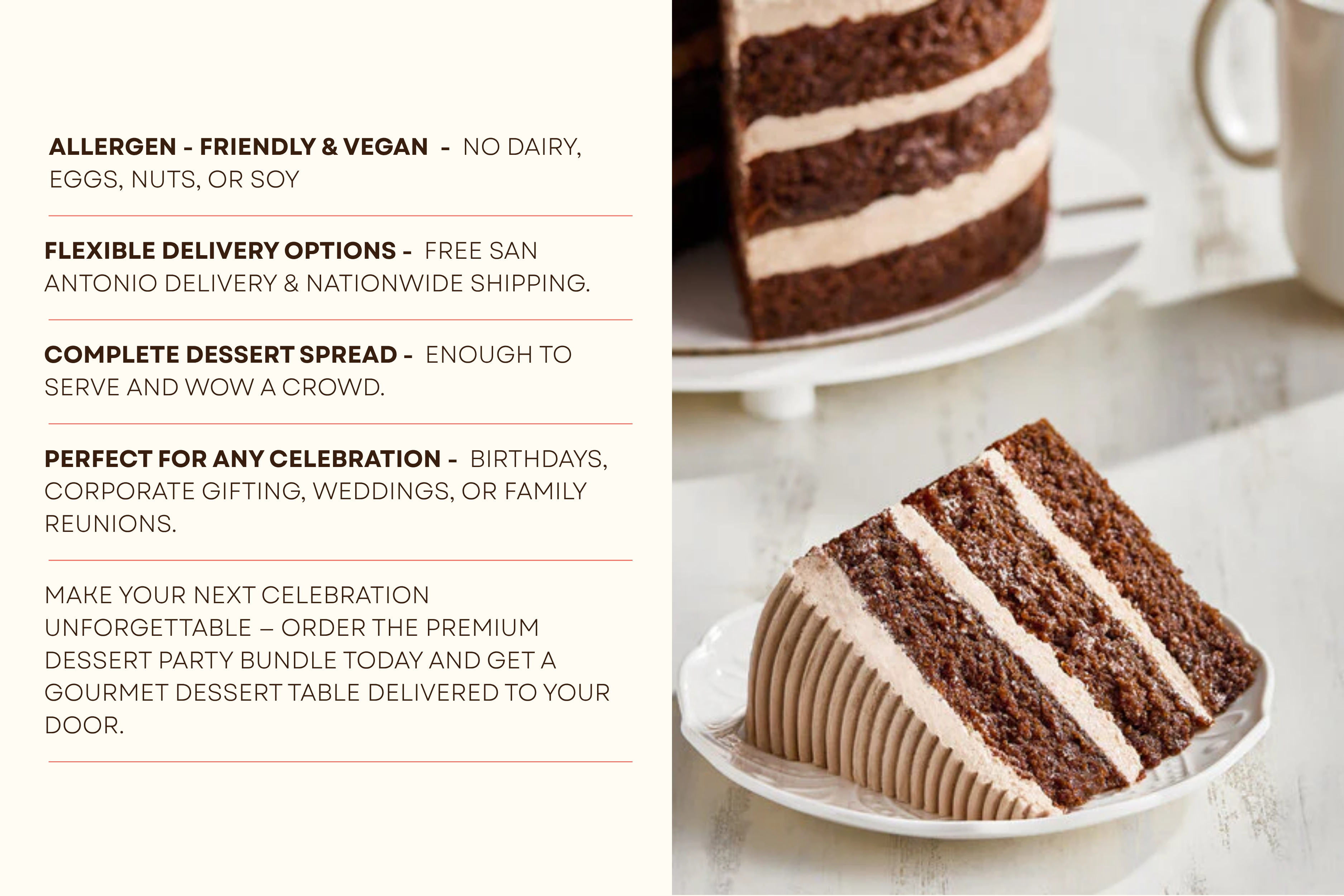The cake serves 10–12, plus 24 individually wrapped treats (12 donuts + 12 cookies). Plan 1–2 treats per guest - so one bundle serves ~18–36. 100% vegan and allergen-friendly (no dairy, eggs, nuts, or soy), individually wrapped, with nationwide shipping included.