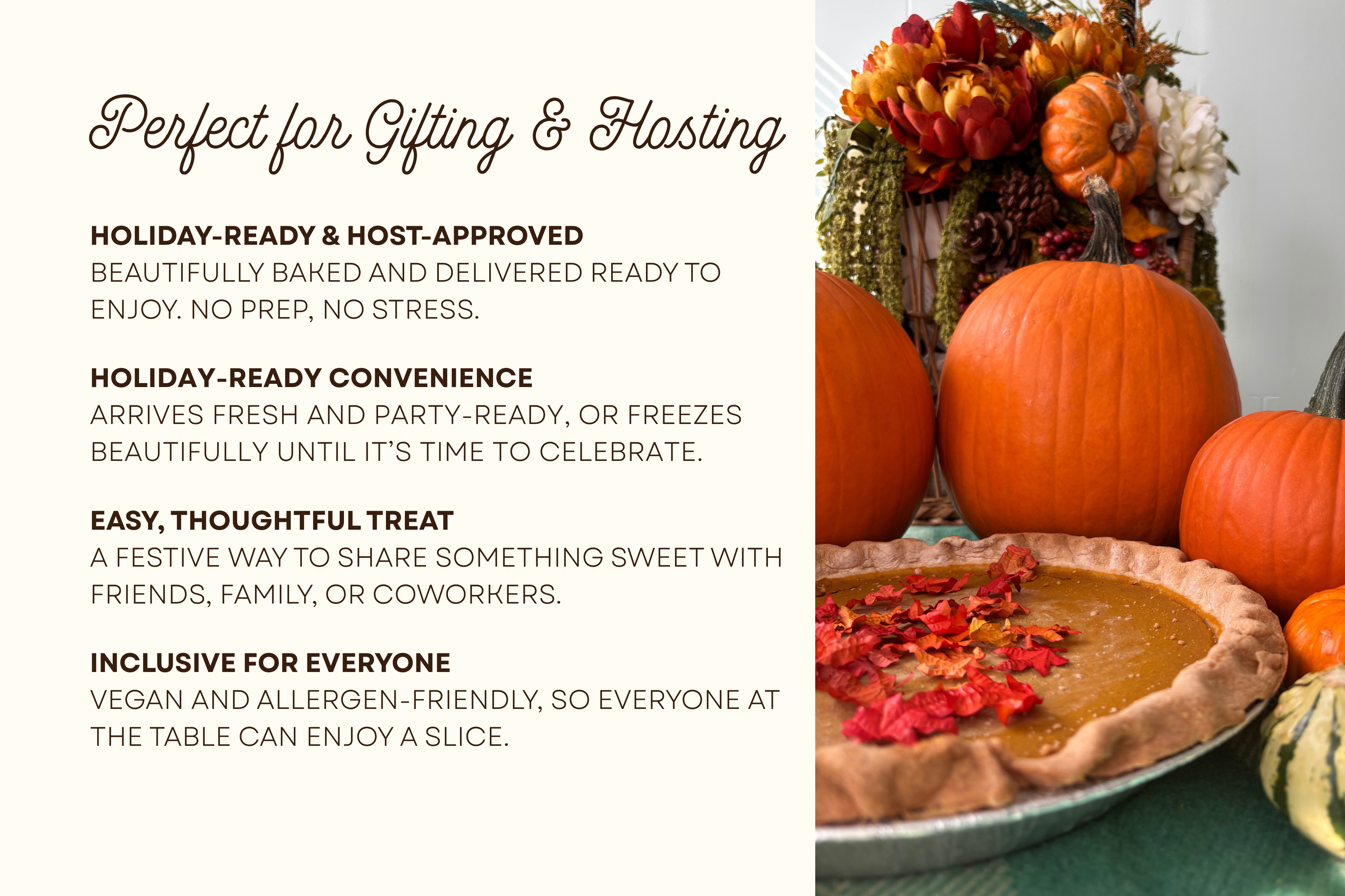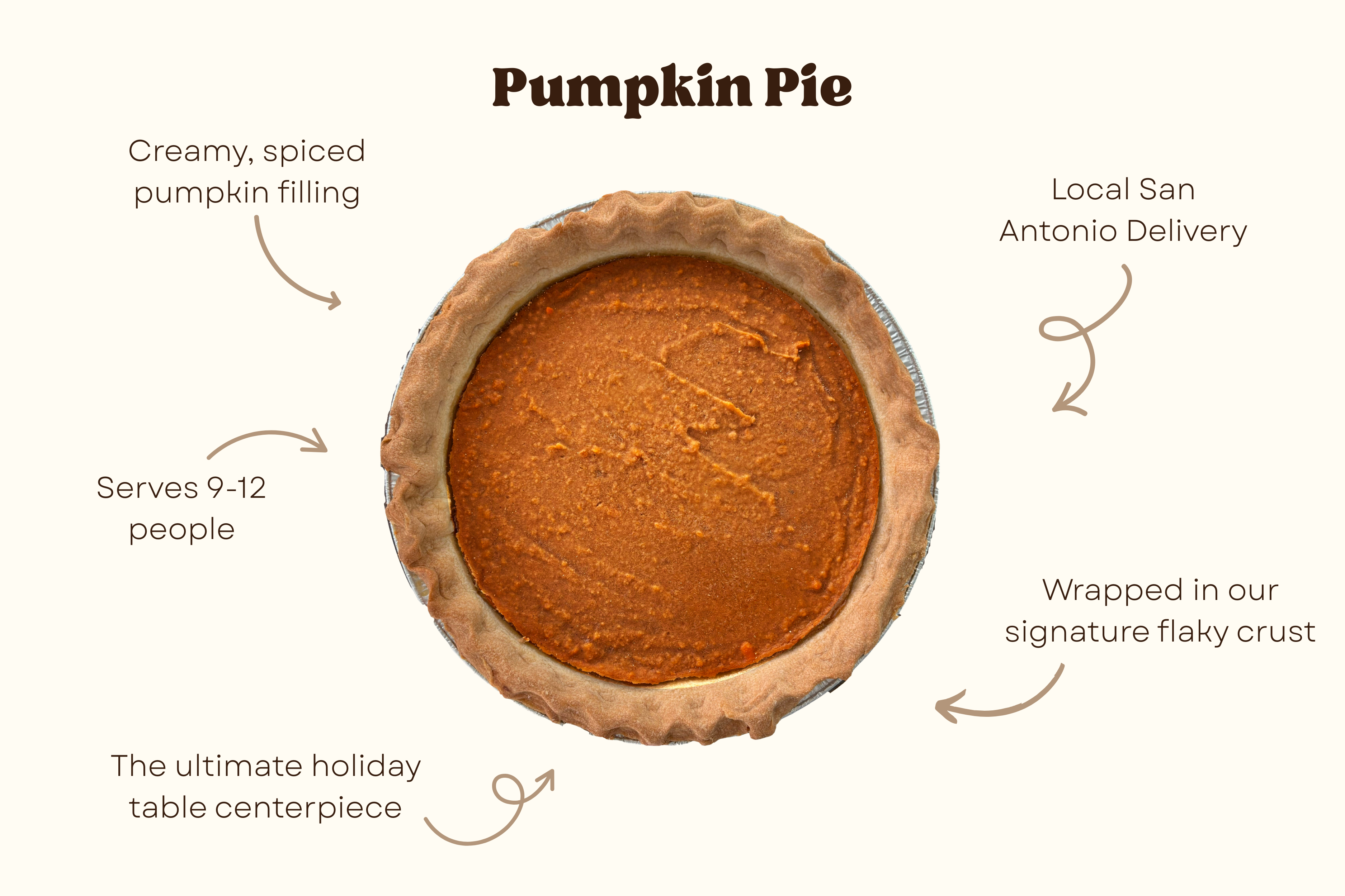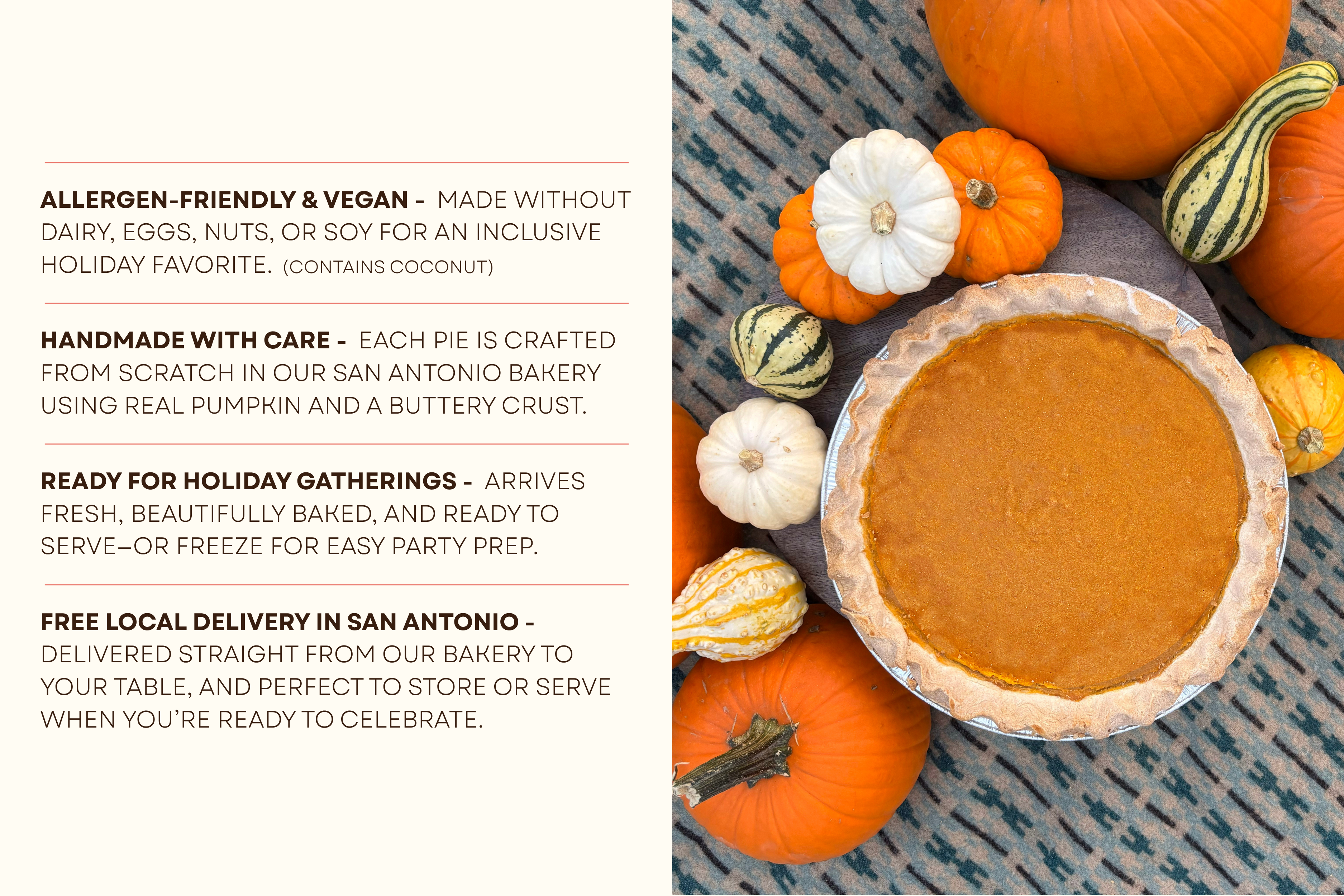 Creamy, dreamy, and unmistakably cozy. Our 11-inch Vegan Pumpkin Pie is baked with real pumpkin purée and warm spices, then nestled into our signature flaky crust. Every dairy-free bite tastes like the best part of Thanksgiving: rich, smooth, and perfectly spiced. Available for local San Antonio delivery only. Contains coconut.
