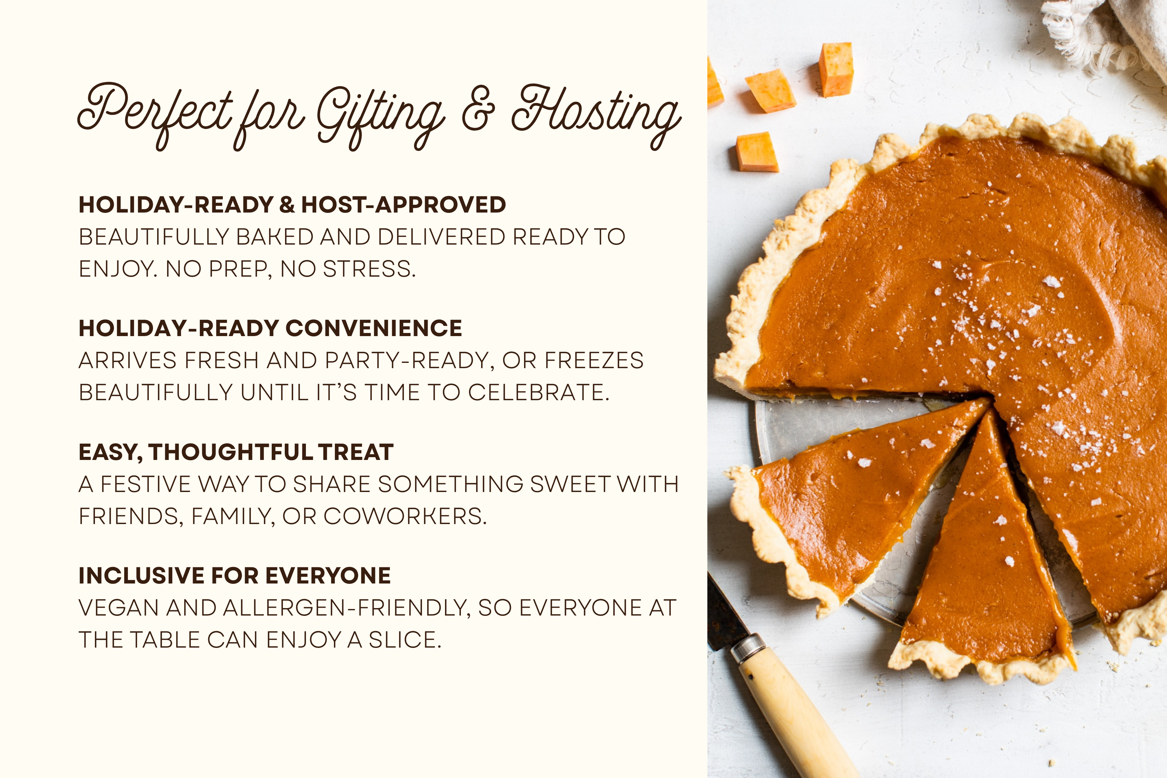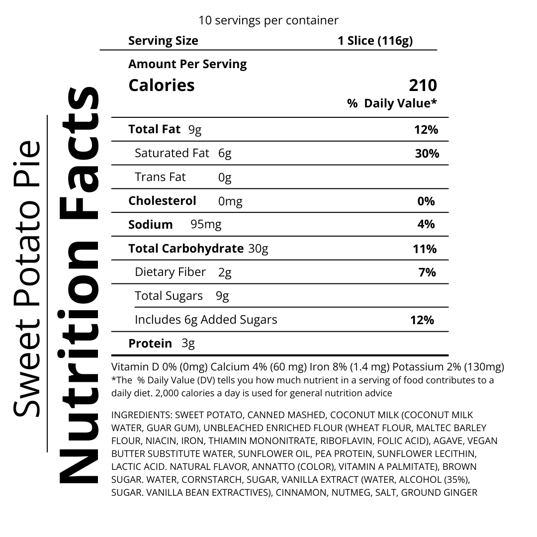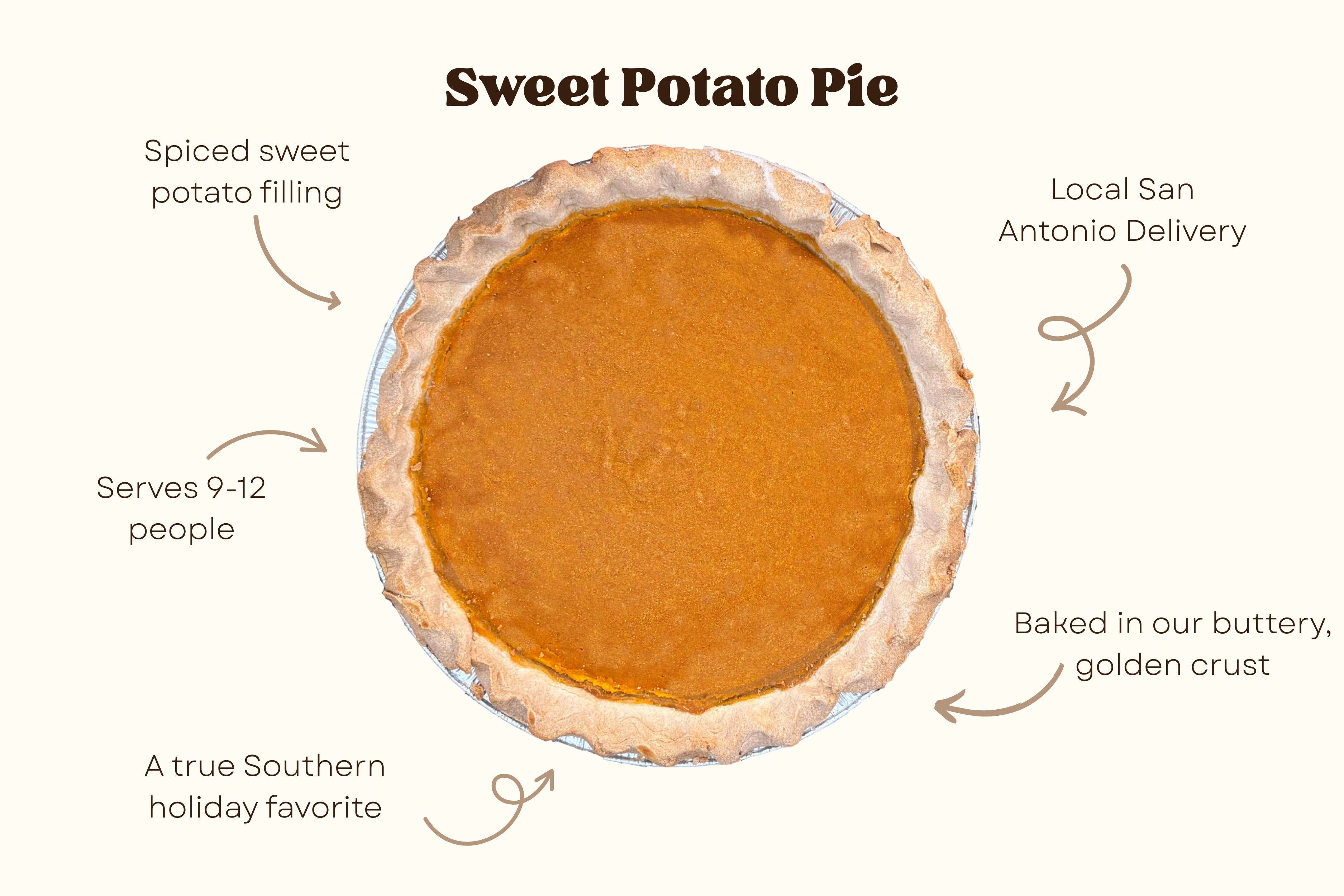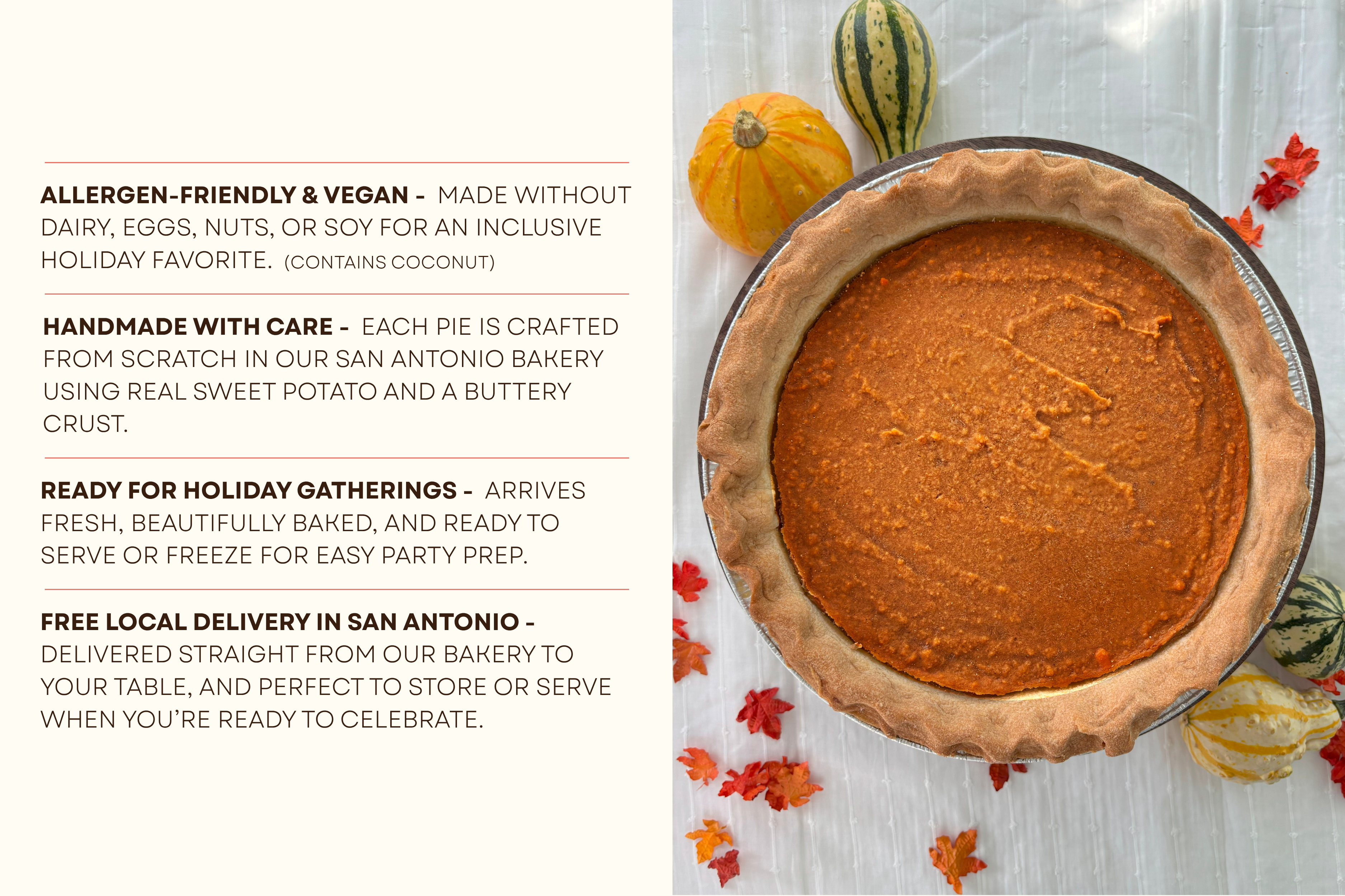 A true Southern favorite, our 11-inch Vegan Sweet Potato Pie brings heritage and heart to every table. We blend velvety sweet potato filling with warm spices and bake it into a golden crust for a dessert that feels like home. Available for local San Antonio delivery only. Contains coconut.